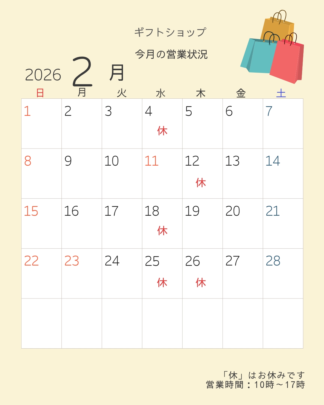 『ギフトショップ』2月定休日のお知らせ
