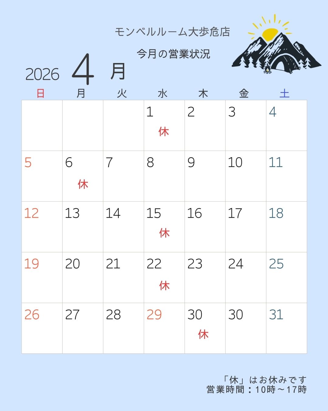 News 2026.03.27 『モンベルルーム大歩危店』4月定休日のお知らせ